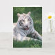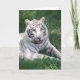 A white tiger with blue eyes against nice green grass sits in this vertical tiger portrait photograph. Great for any tiger lovers!