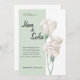 White Tulip wedding invitations with big flowers and green background. Customise the black text, line by line. The full names of the bride and groom are connected by an "and" sign (ampersand). White big white flowers.