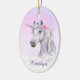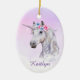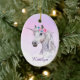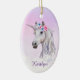 A beautiful white unicorn is decorated with pink and blue flowers, and rises out of fluffy white clouds on this pretty ornament for her. The unicorn image is placed on a gradient pink lavender background with scattered distant stars. At the bottom is her name in darker lavender. The back of the ornament has the same image and background, with a second text field for you to customize, or leave as is. Nice for Christmas, but also appropriate for her birthday or any other special occasion.