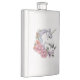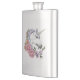 A white unicorn in profile is surrounded by pink, coral, and lavender flowers against a soft blue background.