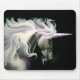 A profile of a white unicorn with purple in the mane in a backdrop of black