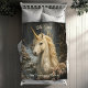 A white unicorn with a golden horn stands among pink orchids in a snowy woodland, with a distant fairytale castle rising behind winter pines. Snowflakes fall gently over the scene, creating a peaceful atmosphere. This fleece blanket is perfect for anyone who loves unicorns, fantasy art, or magical winter landscapes. Ideal for a nursery, bedroom, or cosy reading nook. The design includes encouraging text, which can be edited. Contact me for help with customisation.