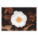 Art features a bright and cheery white wild rose with pale yellow centre on rich copper toned autumn leaves. Original art by Featherfall Studio.