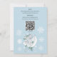 A small white dragon sits amongst white roses against a soft light blue background with delicate snowflakes.