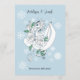 A small white dragon sits amongst white roses against a soft light blue background with delicate snowflakes.