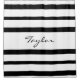 This simply elegant shower curtain is white with six black stripes and room for your name scrawled in black cursive. It's a classy, modern shower curtain that will add a touch of upscale, personalised elegance to your bathroom decor.