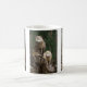 In a serene forest, two white wolves stand on a fallen tree stump, their fur muddied by recent rain. Despite this, their presence commands attention, exuding strength and grace as they survey their domain with alert eyes and poised stances.