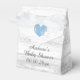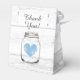 White wood grain boy's baby shower party favour box. Elegant tent shape favour boxes for celebration of new baby boy. Rustic design with wooden background texture, blue vintage hearts and mason jar outline. Perfect for thanking guests coming. Part of matching invitations and stickers.