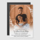 A photo wedding invitation printed on a magnetic card. Pick one of your own photos and upload it, and add the details of your wedding in black letters. There's a transparent white gradient at the bottom to make the text pop! A hand-drawn greenery wreath frames your photo.