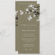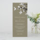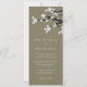 An original illustration of beautiful white cherry blossoms or sakura spring flowers with black branches on a warm grey/grey background. This is a modern double-sided wedding day invitation / wedding dinner reception card.