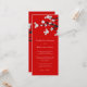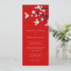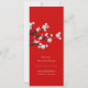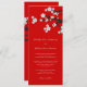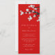 An original illustration of beautiful white cherry blossoms or sakura spring flowers with black branches on a classic red background. This is a modern double-sided wedding day invitation / wedding dinner reception card.