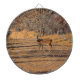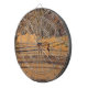 shot closeup that's bright and colourful . That's on a DART BOARD. With tree's in the background.
