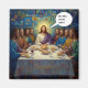 A humorous take on the Last Supper featuring bread, wine and Jesus Christ in the centre, surrounded by disciples, wondering ‘who ate the cakes?’