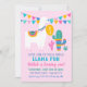 Throw a whole llama fun birthday bash with this vibrant girls' photo invitation featuring a festive llama among desert cactus plants on a pink background. Bold fuchsia and teal "Llama Fun" lettering and a rainbow bunting banner set a playful fiesta tone. The back showcases a navy tropical leaf and cactus pattern with a coordinating photo space and balloon accent. All text is fully customisable including the age, name, and event details.