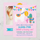 Come join us for a whole llama fun with this colourful birthday photo invitation for girls. A festive illustrated llama draped in a rainbow bunting banner stands among desert cactus plants on a bright pink background. Bold "Llama Fun" lettering in fuchsia and teal announces the celebration, with space for your child's photo on the front. All text is fully customisable including the name, age, and party details.