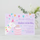 This whimsical birthday invitation features a cute llama eating a birthday cake. I designed it with a fun party feel. The llama is wearing a pink party hat and colourful pompoms. The cake is decorated with rainbow sprinkles and birthday candles. The background of this invitation is a light purple shade and the invitation text is purple. There are also bunting decorations, and stars and confetti in the background. Personalise this invitation with your own text.