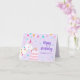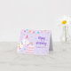This fun 3rd birthday card features a cute whimsical party llama design with a llama eating a birthday cake. There are candles, bunting and stars and confetti on a purple background. Personalise the front with a name and the inside with your special greeting message.