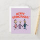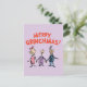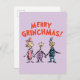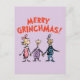 This heartwarming illustration captures the true meaning of Christmas! It features three colorful Whos of Whoville standing together, holding hands, and smiling with their eyes closed, looking like they are happily singing or swaying. They are dressed in unique, whimsical Whoville outfits (pink fringe, purple zigzag, blue stripes). Arching cheerfully above them in bold red text is the phrase: "MERRY GRINCHMAS!" This graphic perfectly embodies the communal and sweet spirit of the holidays!