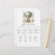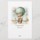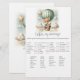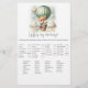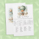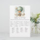 Adventure themed, "Who's My Mommy", baby shower game card with an adorable fox holding a teddy bear riding in a green hot air balloon. The watercolor green sky has white clouds with surrounding gold stars. Templates on back.
