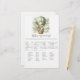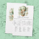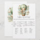 Adventure themed, "Who's My Mommy", baby shower game card with an adorable white and tan puppy holding a teddy bear riding in a green hot air balloon. The watercolor green sky has white clouds with surrounding gold stars. Templates on back.