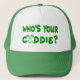 Humourous funny Golfer Cap for dad, mum and other loved ones family and friends. Who's Your Caddie? Funny golf pun print golfer hat features a green cap with Who's Your Caddie? print on white and green visor. Additional details include an adjustable snapback closure at the rear for one size fits all. You can customisable and make it personalised - add name, photo or image. You also have an option to replace existing design with your own design to create a truely personalised gift idea for your favourite golfer.