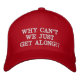 Red hat appropriate for the times that has the quote "WHY CAN'T WE JUST GET ALONG" in bold text.  Great to wear during the United States 2020 presidential campaign.  Can be worn by the conservative or republican in place of the red Donald Trump MAGA hats if you are tired of the fighting.  Or, choose a different colour if you are a liberal, progressive, democrat, or independent voter and are tired of the fighting within their party.