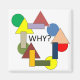 An array of colorful geometric shapes arranged in a circle surrounds the word 'WHY?' in the center. The shapes include triangles, circles, and rectangles in various colors.