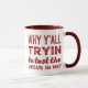 This "Why y'all tryin to test the Jesus in me?" coffee mug is in a dark red/maroon font.