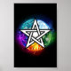 Artistically drawn, luminous pentagram with five magical elements, water, earth, fire, astral, air on black background. Wiccan pentagram. Wicca