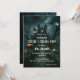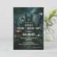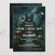 Halloween party invitation featuring an old castle on a dark night, with bats, a cocktail and other obscure items. On the back is a QR code template. Beautiful for a cocktail and costume celebration.