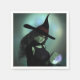 A smiling witch dressed all in black wearing a tall black hat casts a glowing orb spell.