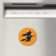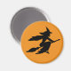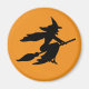 A black wicked witch flying in front of the orange Halloween moon on her broom.