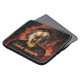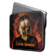 Wicked witch holding a pumpkin. Flames in background. Orange and black colours. I Love Horror text can be customised by you.