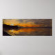 Wide-angle view of the sun setting behind a hill, with rich colours in the sky and the water below.