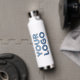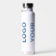 Advertise with your wide business logo repeated 3 times around a branded white water bottle. Replace the sample logo with your own in the sidebar. Your brand symbol can be any shape and colour. This is eco friendly swag your employees, customers and clients will keep and appreciate!