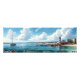 Wide Seascape Mediterranean Bay. A stylised watercolour grain effect coastal view unfolds with a small yacht serenely and slowly gliding through the tranquil, azure waters. Nearby, the traditional Mediterranean village with its white-washed buildings and terracotta roofs nestles against distant hills, embodying relaxed living and scenic beauty.