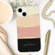 A classy and stylish modern script personalised name Case-Mate iPhone 14 Case with wide colourful and gold striped design featuring Boss Girl Chic colours of of cream, peach, blush and black. Easily personalise this monogram case with your own name to make it your very own.