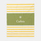 A modern wide horizontal stripes pattern fleece blanket in yellow and spring green. Personalise by adding your name beneath the chic retro daisy logo.