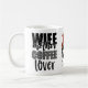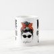 This funny coffee mug features text image "Wife Mother Coffee Lover", messy bun image with red and gold leopard ribbon, and personalised with your name. Perfect for mum's on the go!