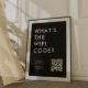 This stylish black poster print sign provides a clean and modern way for customers or guests to access your wifi network instantly with bold typography quote "What's the WiFi Code?". The design features a central QR code area that can be linked to your wifi details so users can scan to connect without typing a password. Enter your network name and any custom instructions that fit your need. The minimalist layout keeps everything readable which works well for cafes, salons, studios, offices, rental properties, pop ups or event venues. Because the template is fully editable, it adapts easily to branding updates or new wifi information. A practical and polished solution that helps streamline customer access and elevates your in person experience.