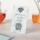 Elevate your space with this minimalist modern table sign, offering a hassle-free way for guests to connect to your WiFi. Upload your personalised QR code and logo, and seamlessly display your network name and password in crisp white lettering. A stylish, functional touch for any setting—perfect for businesses, cafes, or events.
