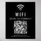 Modern and simple black poster sign to allow your customers, clients or guests to easily connect to your wifi network. Upload your wifi's QR code and add any other details, such as the network's name and password in modern white typography. Perfect for business offices, hotels, vacation rental properties, etc.