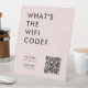 A simple custom pink "What's the WiFi Code?" scan to connect to Wifi business pedestal sign template in a modern minimalist style which can be easily updated with your QR code, network details or custom text.