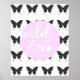 Elegant black, white, and pink design with silhouetted butterfly tile background. Pink circle overlay acts as canvas for the white calligraphic lettering, allowing the "Wild and Free" message to pop. Perfect for any room in a dorm or home.