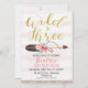 Are you after a wild and three 3rd birthday invitation for your little girl? This cute design features a and arrow, floral arrangement and some faux gold textured text. The background is an off white and pale pink striped pattern. The back of the invitation features a watercolor brown and off white tribal pattern. This girls wild and three birthday invitation is ready to be personalized.