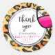 Thank you stickers for a bachelorette party with a wild animal pattern and a cool looking wine glass. The wine inside the glass is hot pink. Thank you written in a cool trendy font.