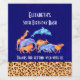 A wine bottle label for a birthday bash designed with an exotic orange coloured leopard print pattern along the bottom. Illustrated with a digital watercolor image of a herd of wild animals running together. Animals include a jumping dolphin, a giraffe, elephant, kangaroo, rhino, lion and leopard.The background is a bluish purple colour. Personalise with your event details.