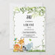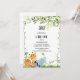 This cute party invite is perfect for your little boy's first birthday! A modern design featuring a frame of green watercolor leaves (tropical leaves like monstera and palm), a monkey wearing a safari hat, an elephant, a tiger, a zebra, a lion, a hippo, and a giraffe!