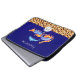 Laptop sleeve designed with an exotic orange coloured leopard print border along the bottom. Illustrated with a digital watercolor image of a herd of wild animals