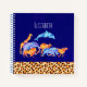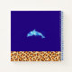 A square spiral notebook designed with an exotic orange coloured leopard print border along the bottom. Illustrated with a digital watercolor image of a herd of wild animals running together. Animals include a jumping dolphin, a giraffe, elephant, kangaroo, rhino, lion and leopard. The background is a bluish purple colour.